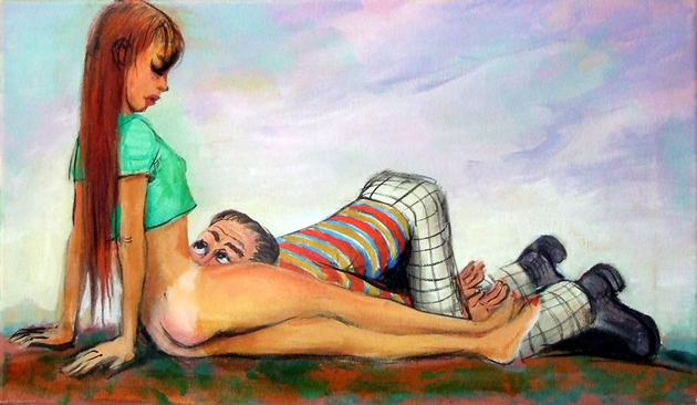 En los cuadros de Mead, las niñas casi nunca son víctimas, sino ejecutoras, vengadoras, viciosas o, como máximo, hacen gala de esa falsa inocencia que Weininger atribuye a la hembra humana. Los niños apenas se asoman a este país de las pornomaravillas y, cuando lo hacen, suelen estar disfrazados de niña (a ciertas edades, sólo la entrepierna diferencia a ambos sexos). En cuanto a pinturas puramente homosexuales, sólo recuerdo una, en la que un adolescente de enorme rabo se masturba mientras chupa el micropene de un niño mariquita y una niña los observa desde un cuadro. En este sentido, Stu afirma que:
