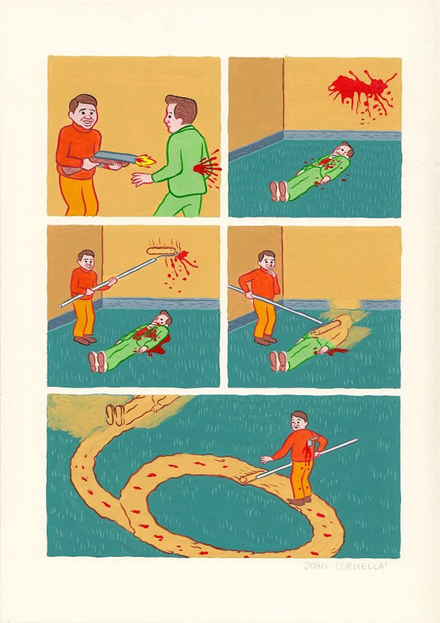 Joan Cornellà (Barcelona, 1981) Ilustrador español que combina diferentes estilos que bien se puede apreciar en sus viñetas, opta por un estilo más naïve para contarnos a través de ilustraciones silenciosas, situaciones surrealistas y de mucho humor negro. De lo macabro a lo crítico, los colores vivos sumado a su estilo conforman un lenguaje atractivo en total contradicción con lo que expresa. Toda una delicia semiótica.